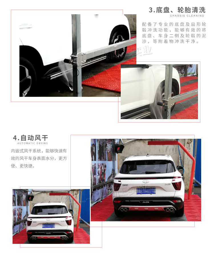 闖王風(fēng)尚型全自動(dòng)洗車機(jī),高壓泡沫無需人工操作,自動(dòng)調(diào)比。通過混合、霧化等步驟,形成微顆粒狀,噴灑覆蓋車身表面,接觸污漬,包括車身縫隙都?jí)蚓鶆蚋采w;360°旋轉(zhuǎn)式高壓沖洗,勻速、勻壓、勻距的沖洗方式,清洗盲區(qū);配備底盤及扇形輪轂沖洗功能,能夠有效的將底盤、車身二側(cè)及輪轂的泥沙,等附著物沖洗干凈;自動(dòng)風(fēng)干 旋內(nèi)嵌式風(fēng)干系統(tǒng),能夠快速的風(fēng)干車身表面水分,更方便、更快捷??蓪?shí)現(xiàn)一鍵掃碼洗車。