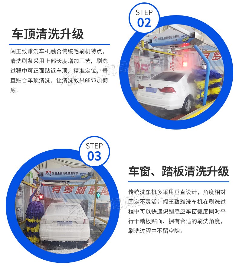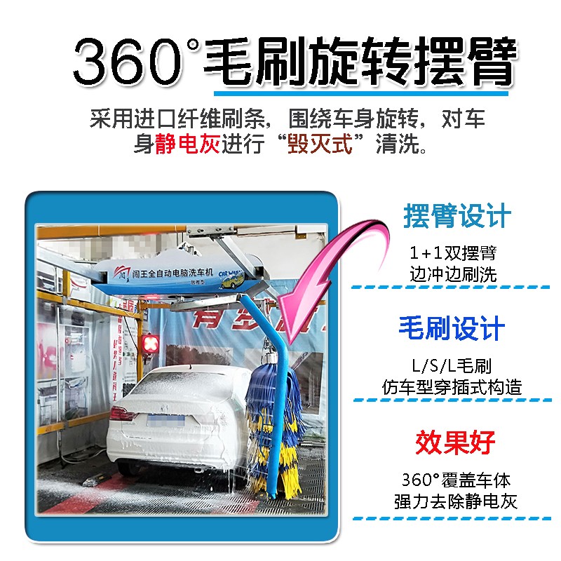 闖王360度毛刷洗車機用的是進口泡棉刷、不傷車漆、不沾泥沙、不易纏繞雜物、柔軟耐磨、洗凈度高。操作簡單省時省力自動清洗,1+1雙擺臂邊沖邊刷洗,L/S/L毛刷仿車型穿插式構(gòu)造,360°覆蓋車體強力去除靜電灰,加油站引流機型。