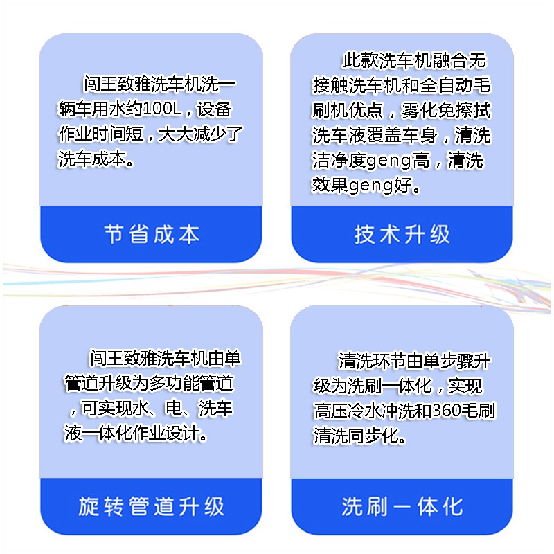 闖王360度毛刷洗車機用的是進口泡棉刷、不傷車漆、不沾泥沙、不易纏繞雜物、柔軟耐磨、洗凈度高。操作簡單省時省力自動清洗,1+1雙擺臂邊沖邊刷洗,L/S/L毛刷仿車型穿插式構(gòu)造,360°覆蓋車體強力去除靜電灰,加油站引流機型。 闖王360度毛刷洗車機用的是進口泡棉刷、不傷車漆、不沾泥沙、不易纏繞雜物、柔軟耐磨、洗凈度高。操作簡單省時省力自動清洗,1+1雙擺臂邊沖邊刷洗,L/S/L毛刷仿車型穿插式構(gòu)造,360°覆蓋車體強力去除靜電灰,加油站引流機型。自動風(fēng)干系統(tǒng),能夠快速高效的風(fēng)干車身表面水分,更方便、更快捷。